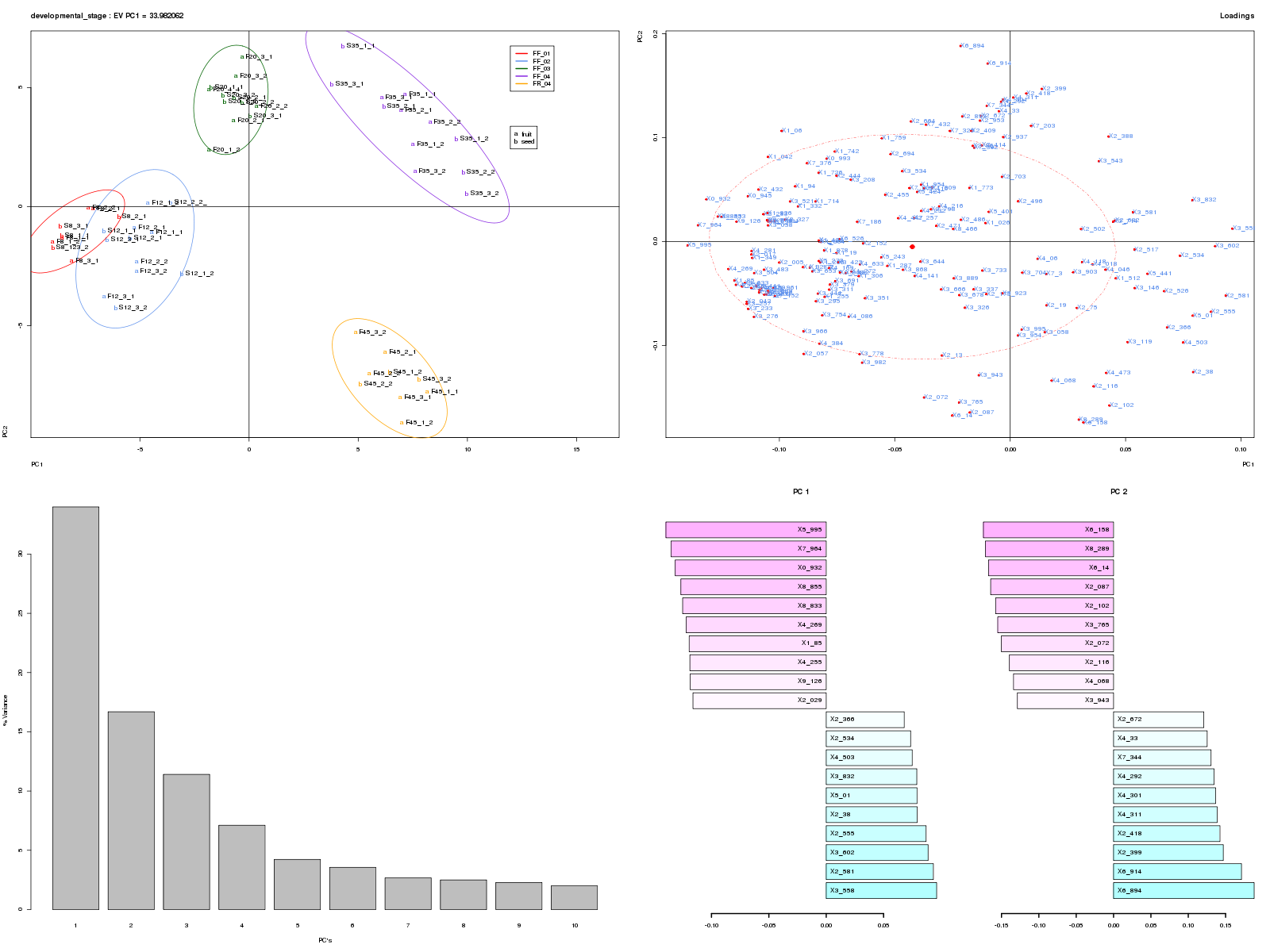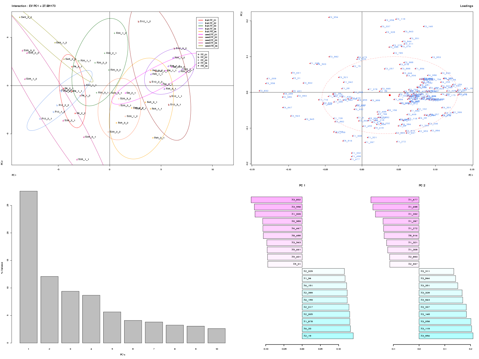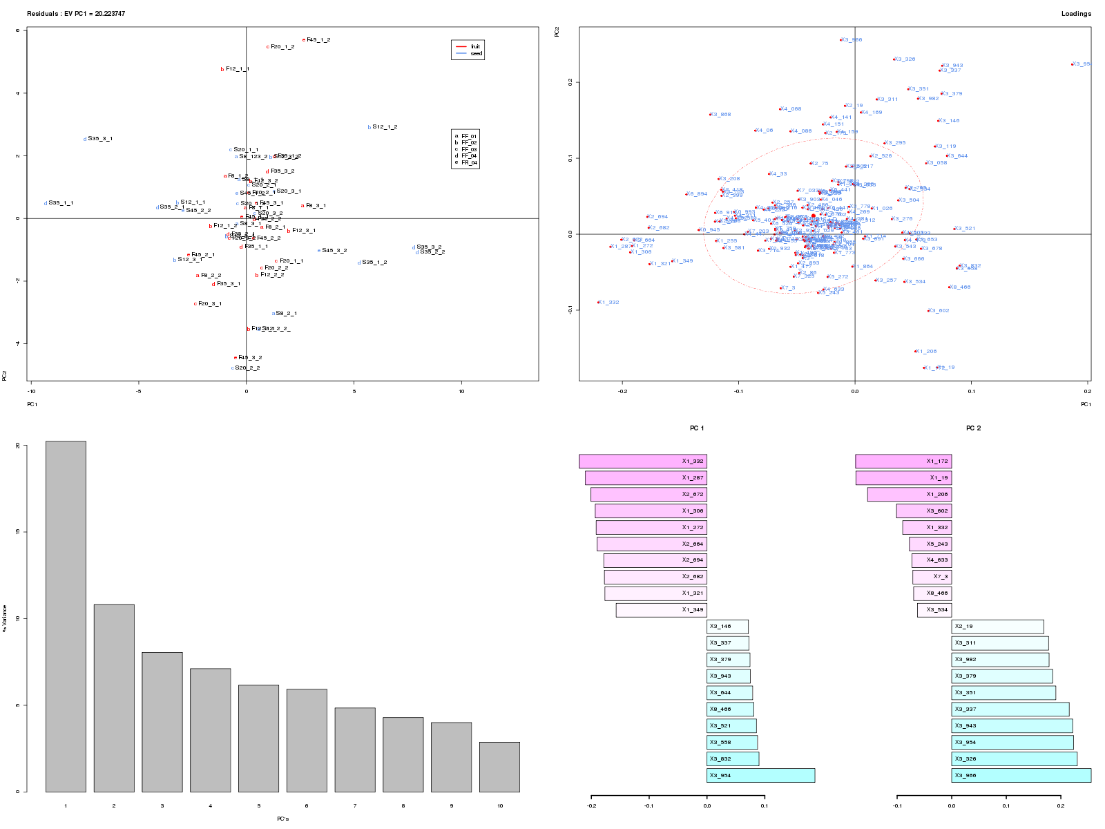 ANOVA-PCA is a combination of both methods developed by Harrington. The data is partitioned into submatrices corresponding to each experimental factor, which are then subjected to PCA separately after adding the residual error back. If the effect of a factor is large compared to the residual error, separation along the 1st PC in the score plot should be evident. With this method, the significance of a factor can be visually determined.